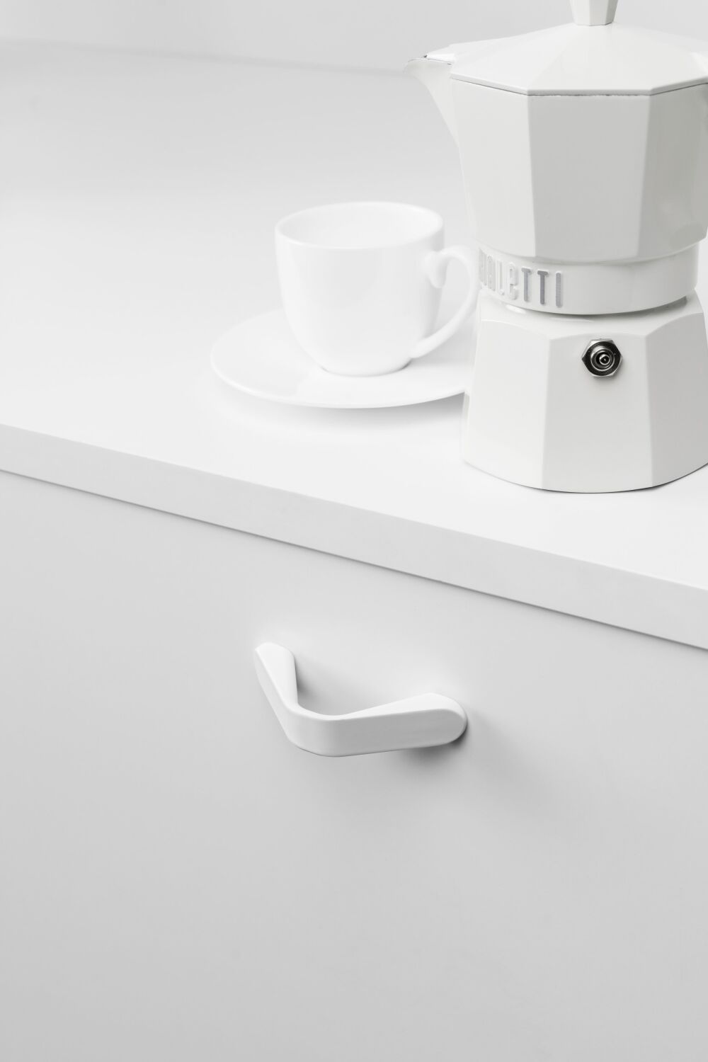 De Dropp greep van Viefe in mat wit aluminium heeft een opvallend vloeiende vorm met zachte rondingen. Het eigentijdse ontwerp combineert functionaliteit met een minimalistische uitstraling en is leverbaar in twee lengtematen, passend bij diverse kast- en ladeformaten.